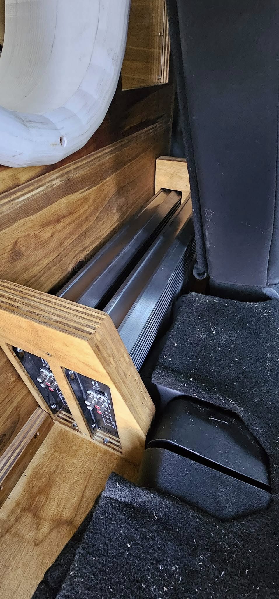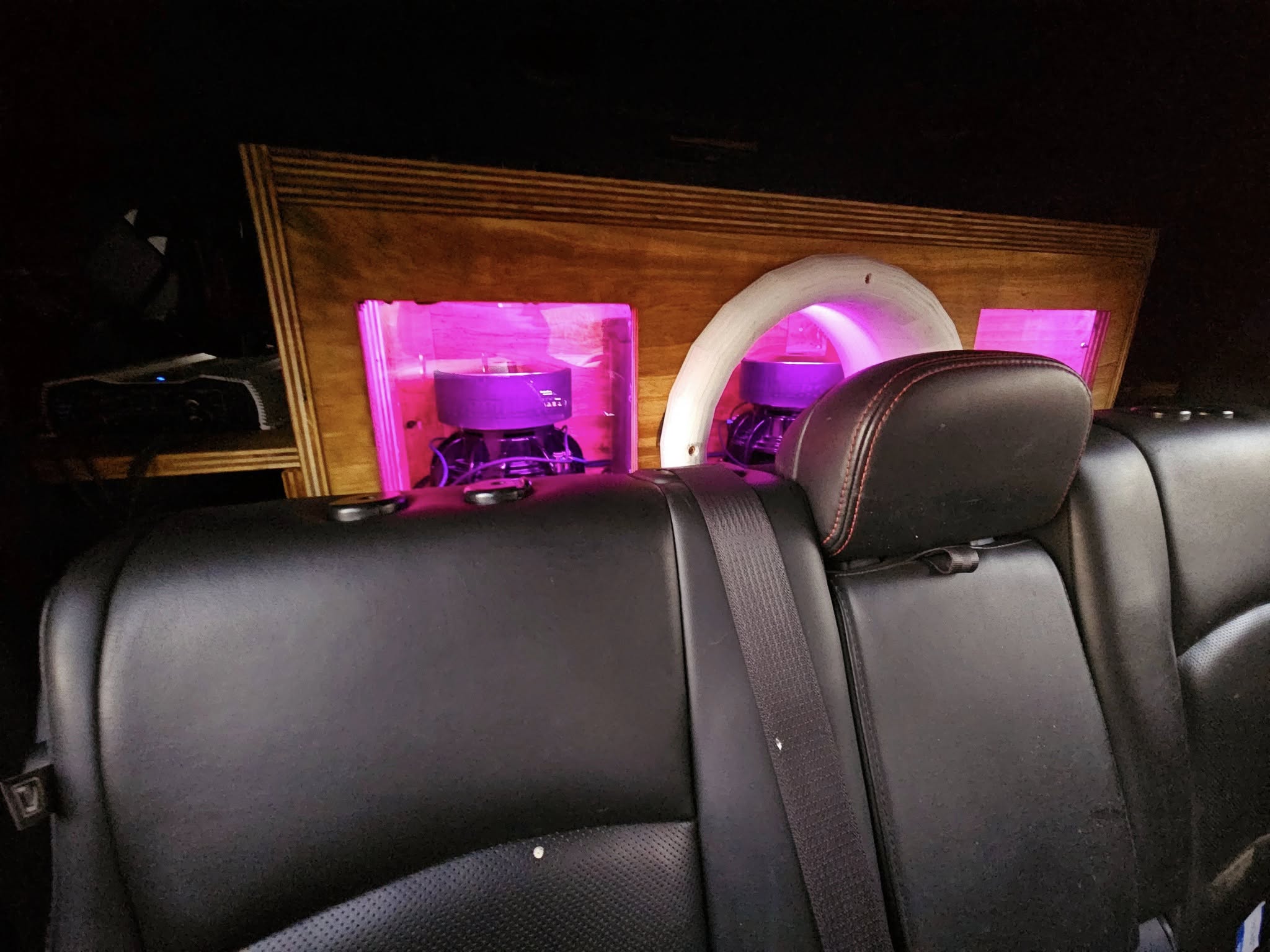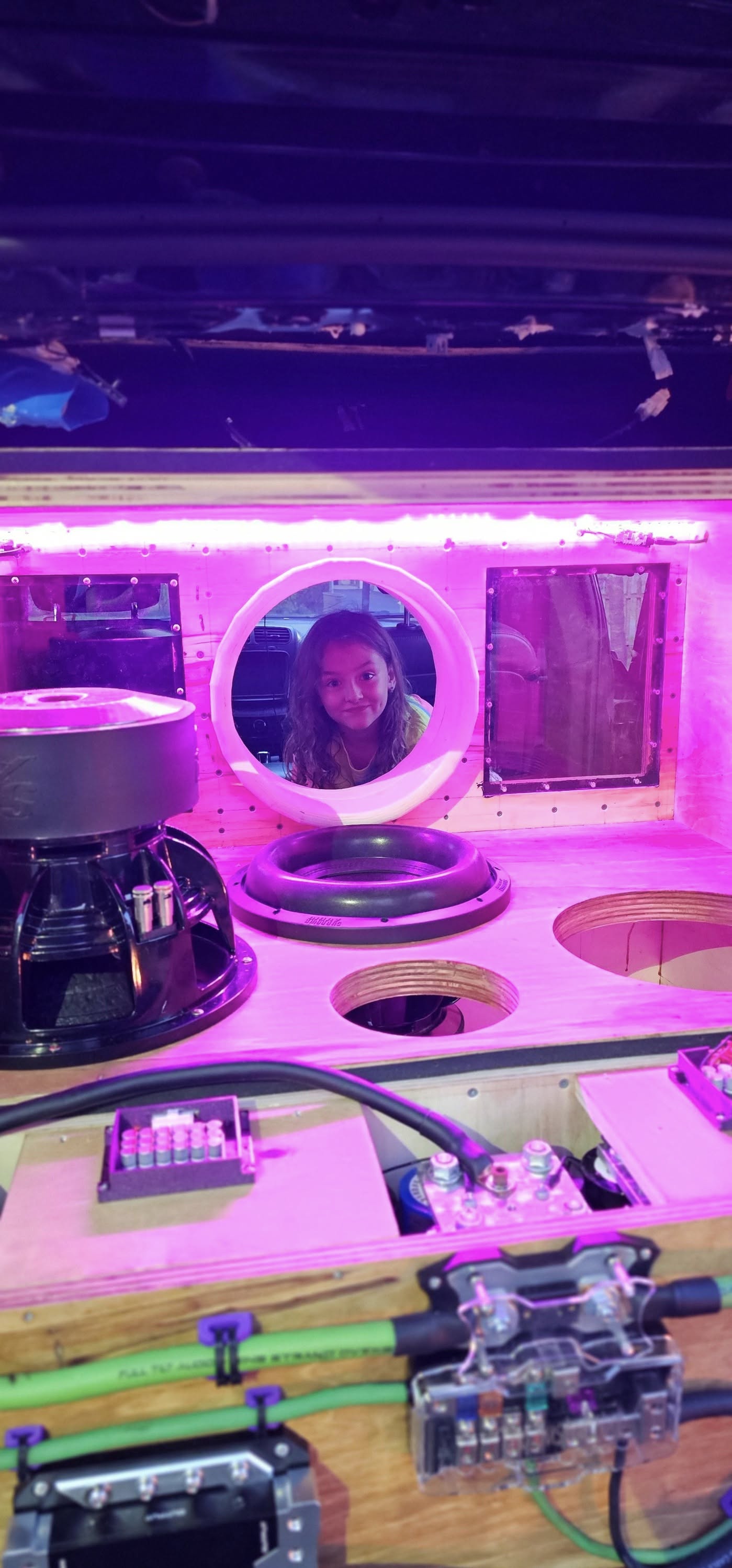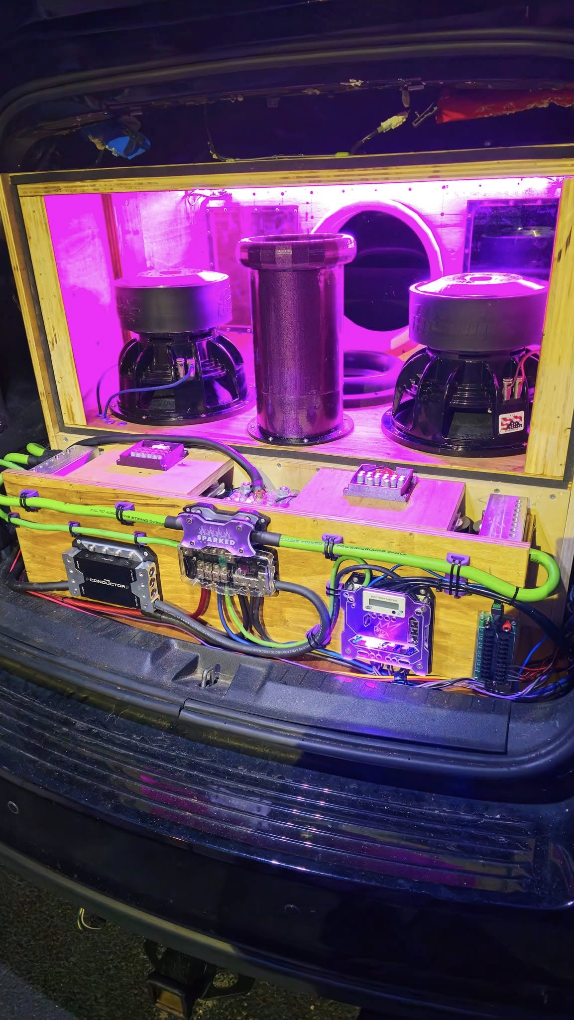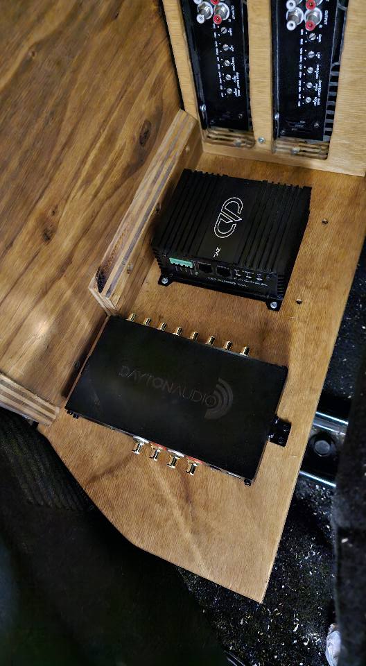 Three Sundown XV2 12"s in a slide in ( unfinished still ) C-pillar 6th order. Will be powered by a pair of CAB 4500s at .7 per. Singer 320amp with 140AH of XS Power LTO in a 6s2p setup.Mids and Highs in the works
